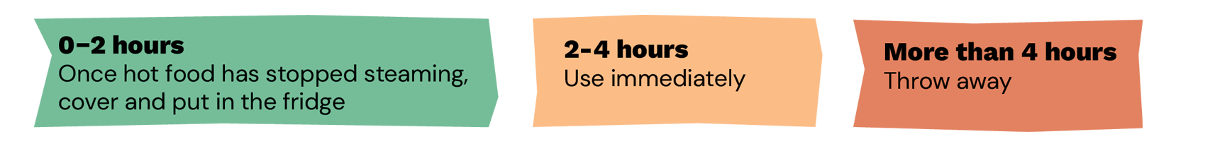 - Between 2 and 4 hours post cooking: consume food immediately or throw away.