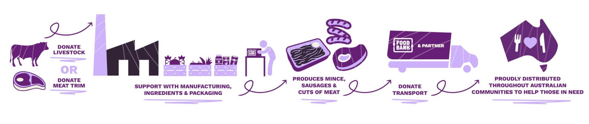 Our Protein Program works with the entire protein supply chain — from livestock producers and stock feed suppliers to transporters, processors, manufacturers, and packaging suppliers — to provide a reliable, regular supply of meat such as sausages and mince for those in need.